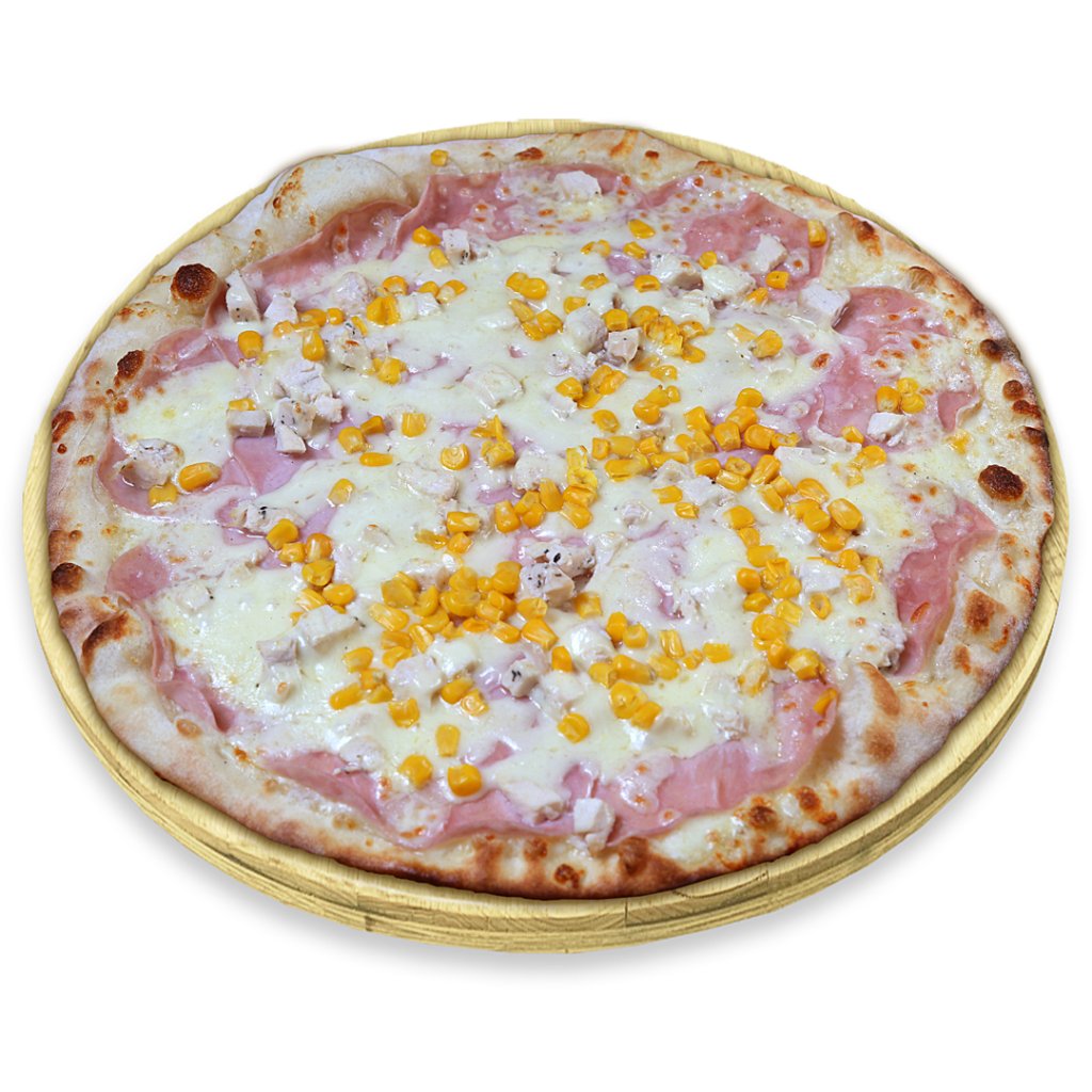 smetana,mozzarela,šunka,kuřecí maso,kukuřice,eidam
