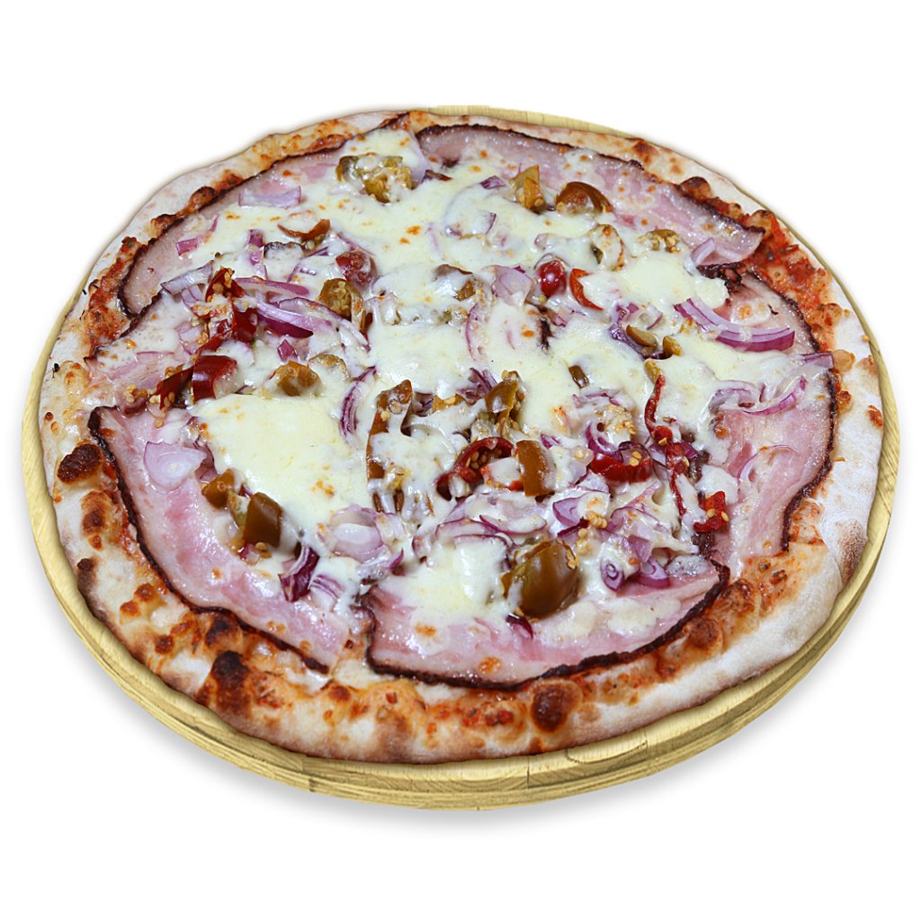 polpa,mozzarela,slanina,červ.cibule,česnek,drcené chilli, eidam