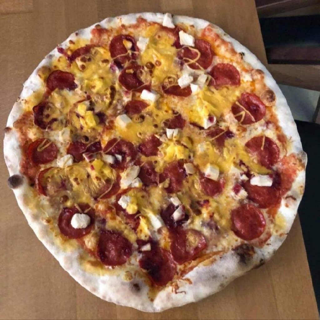 polpa,mozzarella,pikantní salám, kuřecí maso,čedar,hořčice,brusinky